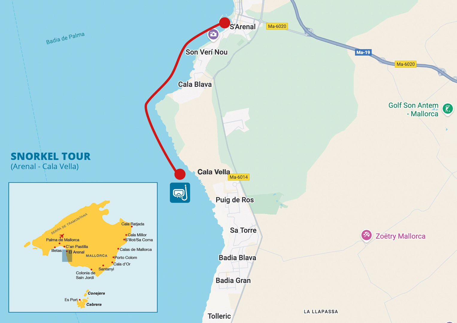 Disfruta de una aventura sobre y bajo el mar. Este viaje de dos horas en nuestra embarcación más tradicional te ofrece la oportunidad de realizar snorkel en el Parque Natural de Cala Vella. Navega en la Reserva Marina de Bahía de Palma y disfruta de las vistas panorámicas de las calas protegidas, acompañado siempre con nuestro guía. Llegado el momento de la actividad, te facilitaremos, máscara, tubo y aletas; practica snorkel y observa en las cristalinas aguas la flora y fauna del mar mediterráneo. Nuestro guía te mostrará el camino y te facilitará las instrucciones necesarias para tu seguridad. Además del material necesario, te ofrecemos la posibilidad de un servicio de cámaras submarinas para capturar los mejores momentos y poder tener un bonito recuerdo.